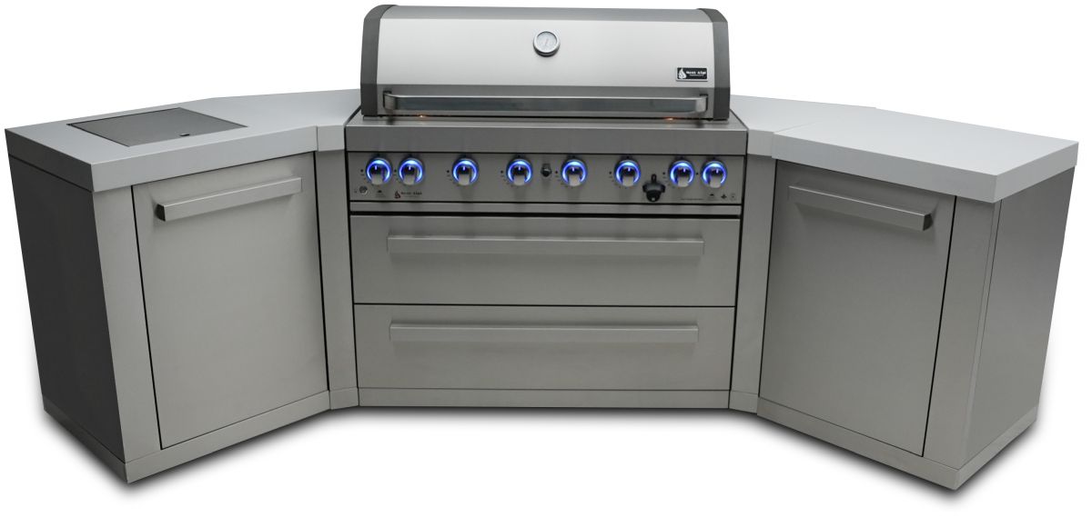 The grill comes standard with LED knob lights that are blue when off and red when on and bright internal cooking lights for perfect vision and precision control. The 45 degree angle modules offer extra prep space and a stylish statement, perfect for patios and yards with corners.