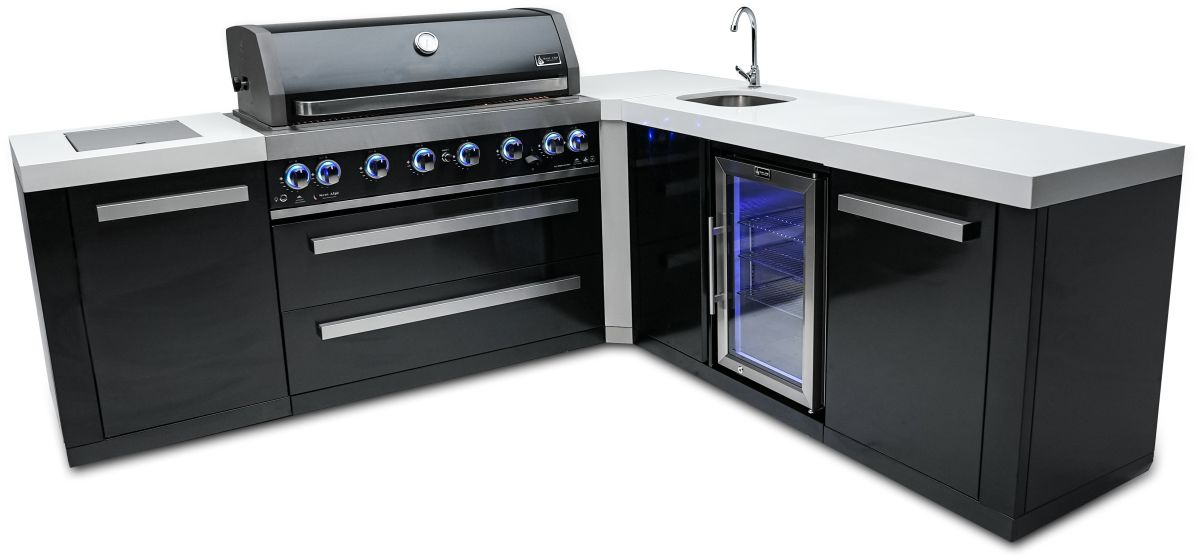 The grill comes standard with LED knob lights that are blue when off and red when on and bright internal cooking lights for perfect vision and precision control. The 90 degree beverage module provides extra prep area, an outdoor rated refrigerator with LED internal lights and 6 settings plus a sink and faucet.