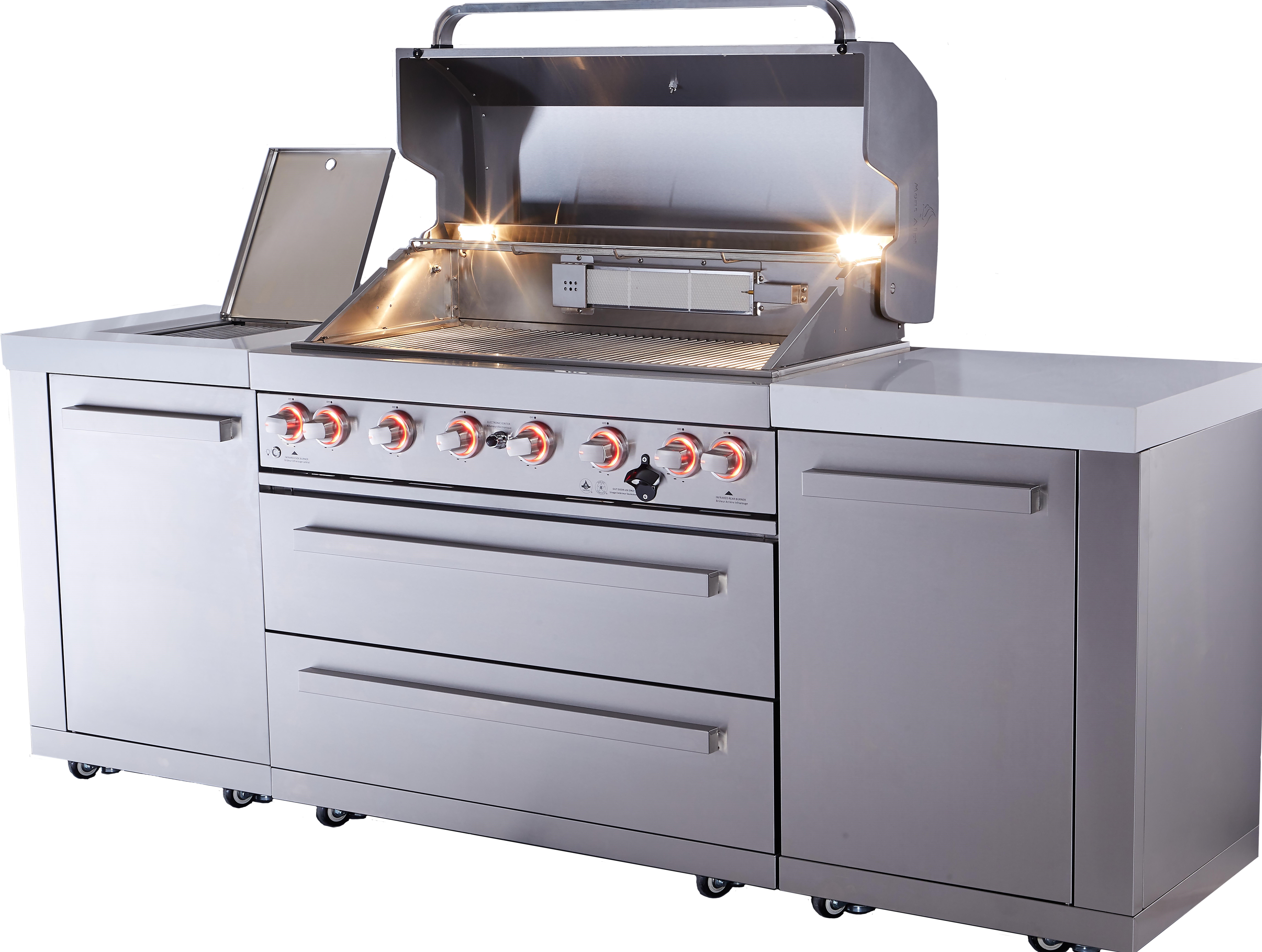 The island 6-burner gas grill is a prefabricated all 304 (marine grade) stainless steel gas grill with modern white granite topped side cabinets. It has a large 6 burner (115,000 BTU) grill with additional infrared rear burner. It comes fitted with halogen lights in the cooking zone to make grilling in the dark a lot easier. There are also blue LED lights on each control knob.Read More