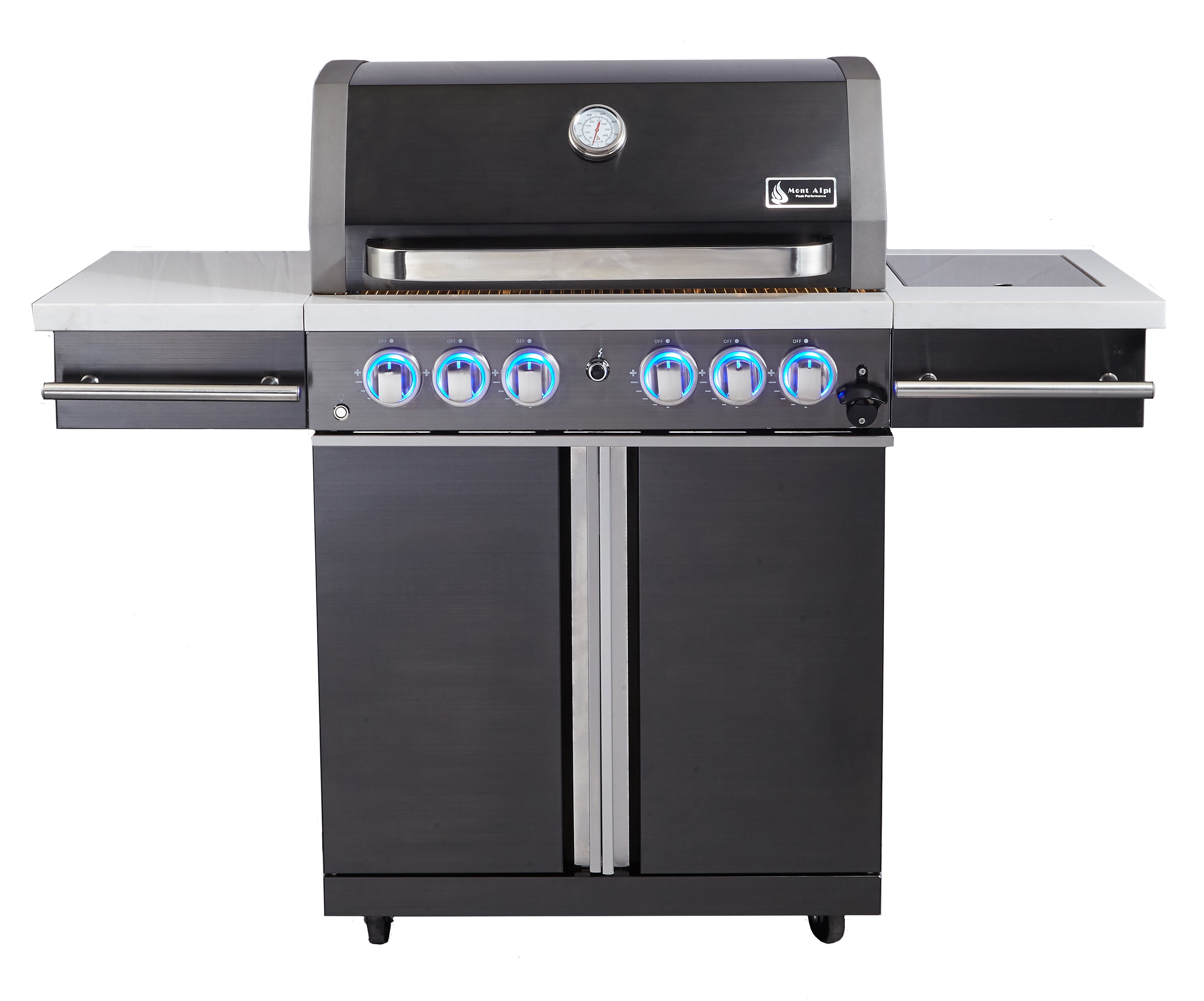 A robust stylish and fully black stainless steel cart grill with white granite side shelves. Offers 4 heavy duty 304 stainless steel burners making even the most beginner chefs able to craft professional meals. It is also equipped with the ceramic infrared back and side burners great for when you cook a large roast or use the heavy duty rotisserie kit that is included.Read More